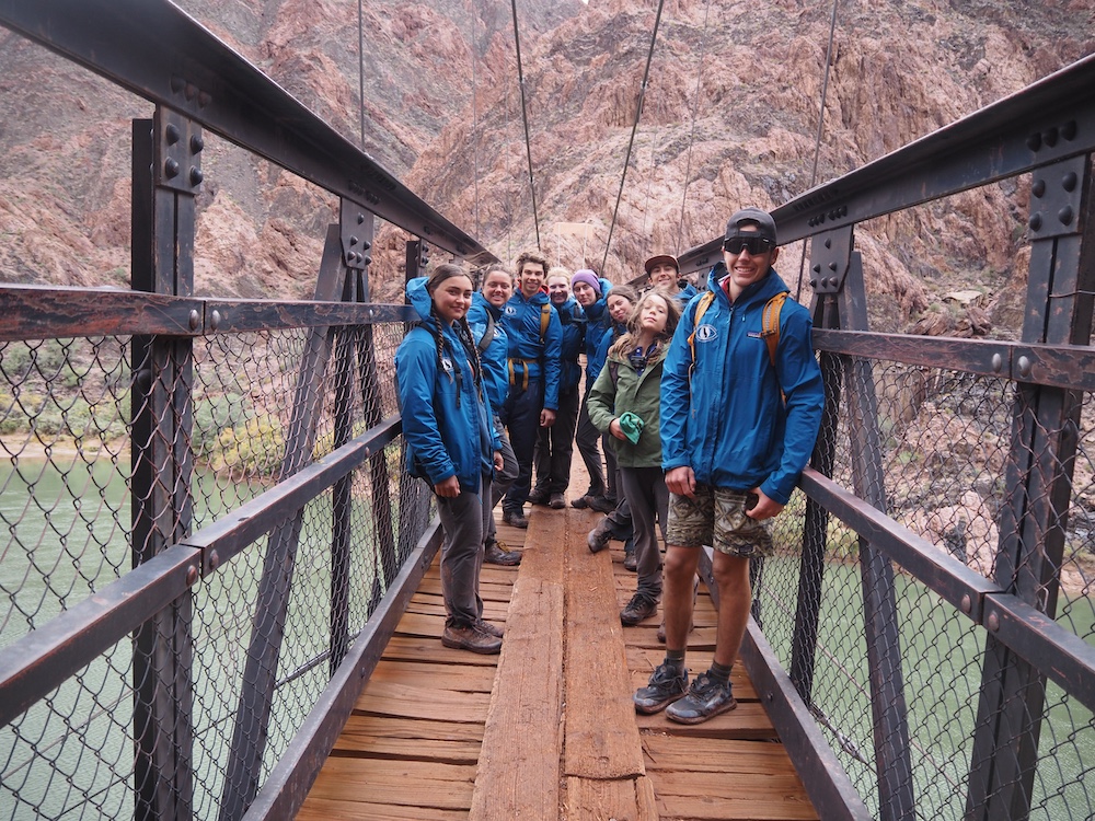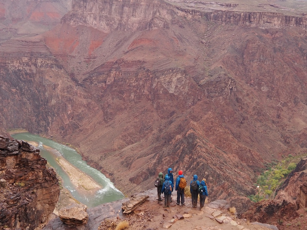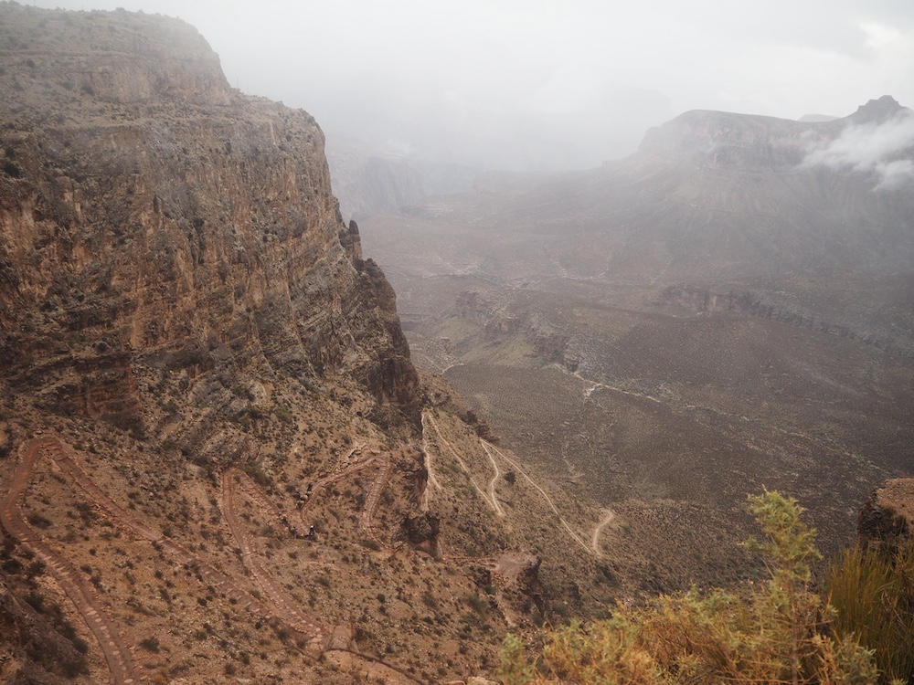 At 5 am in the dark as the rain drizzles down on us, we pack up camp. The cloud cover creates a thick fog as we drive. We scramble to eat our breakfast of yogurt and granola in the parking lot as the rain picks up, then begin our descent just as dawn is breaking. Coming across signs cautioning us about trail closures and “Do not attempt to hike rim to rim in one day”, we still proceed. The trail begins to flood with rain water as we walk along a ridge, the sky becoming clearer, and the temperature becoming warmer as we hike down further. The strong wind creates a cold feeling on any exposed skin. Finally, we see the Colorado River.