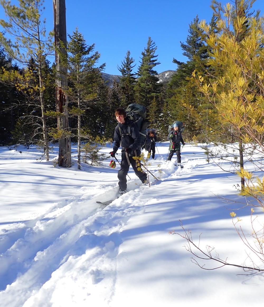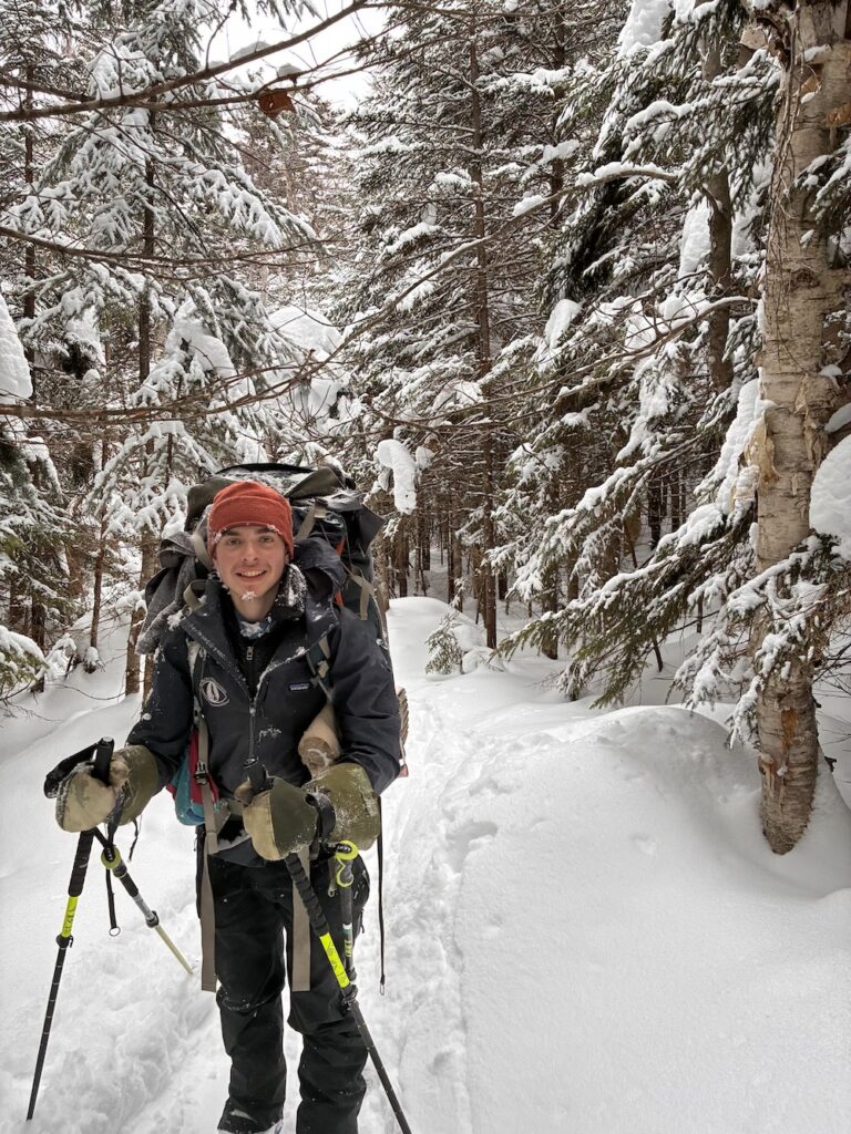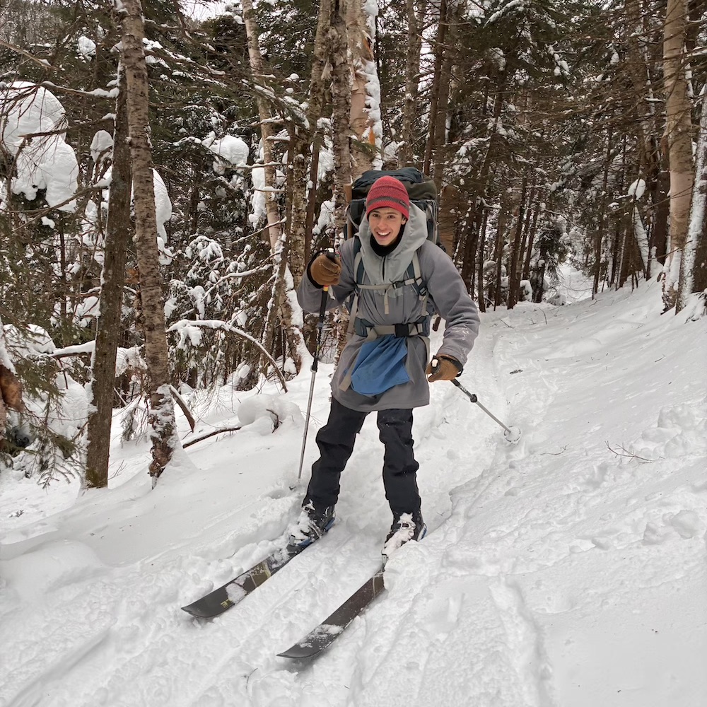 We climbed beautiful hills, following the Pemigewasset on a decommissioned railway, crossed the river, resupplied food, and skied up Tripoli road and into the White Mountains! We broke camp by an abandoned cellar hole, dubbing the camp “Old Settler’s Camp”