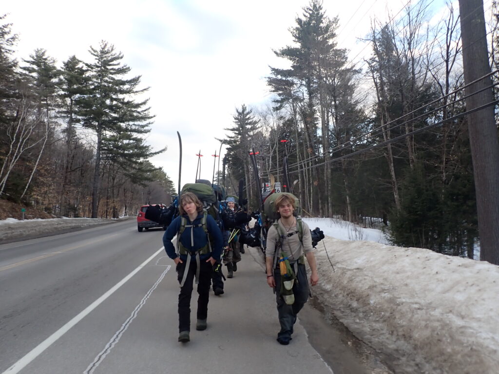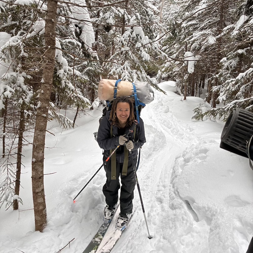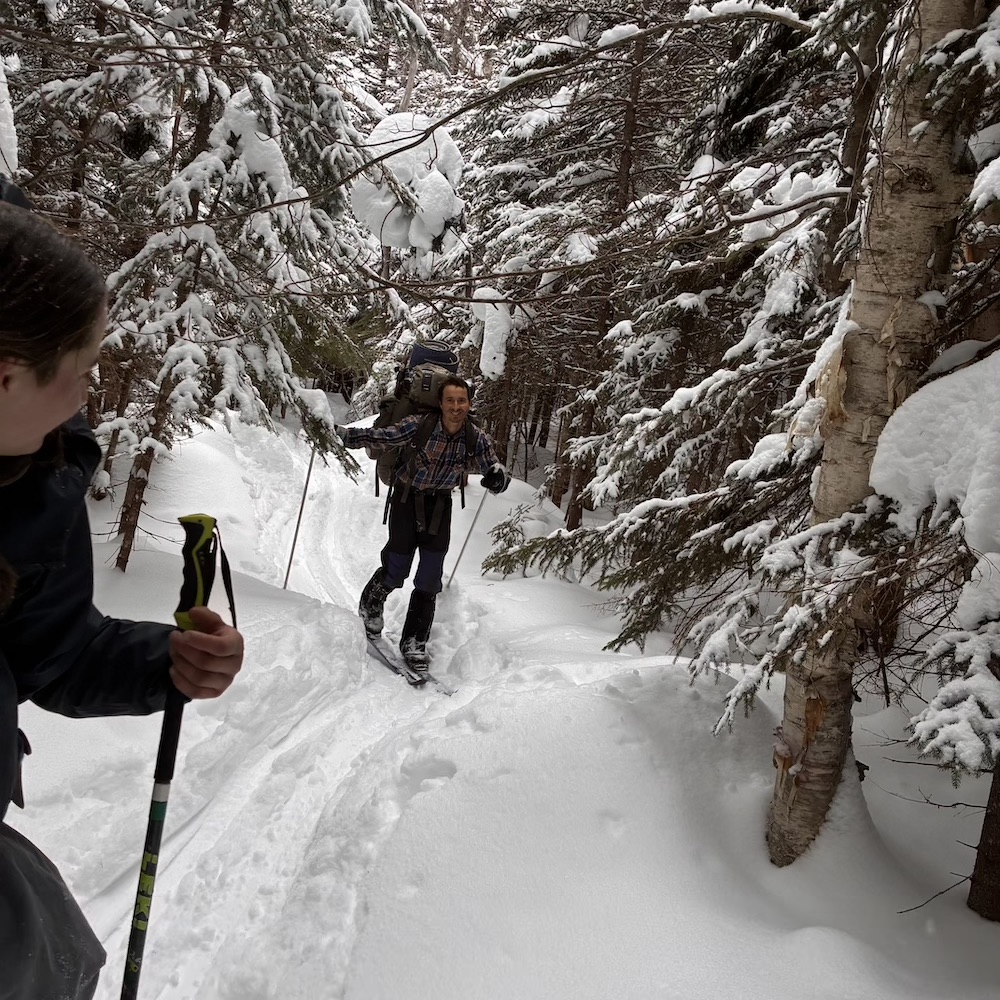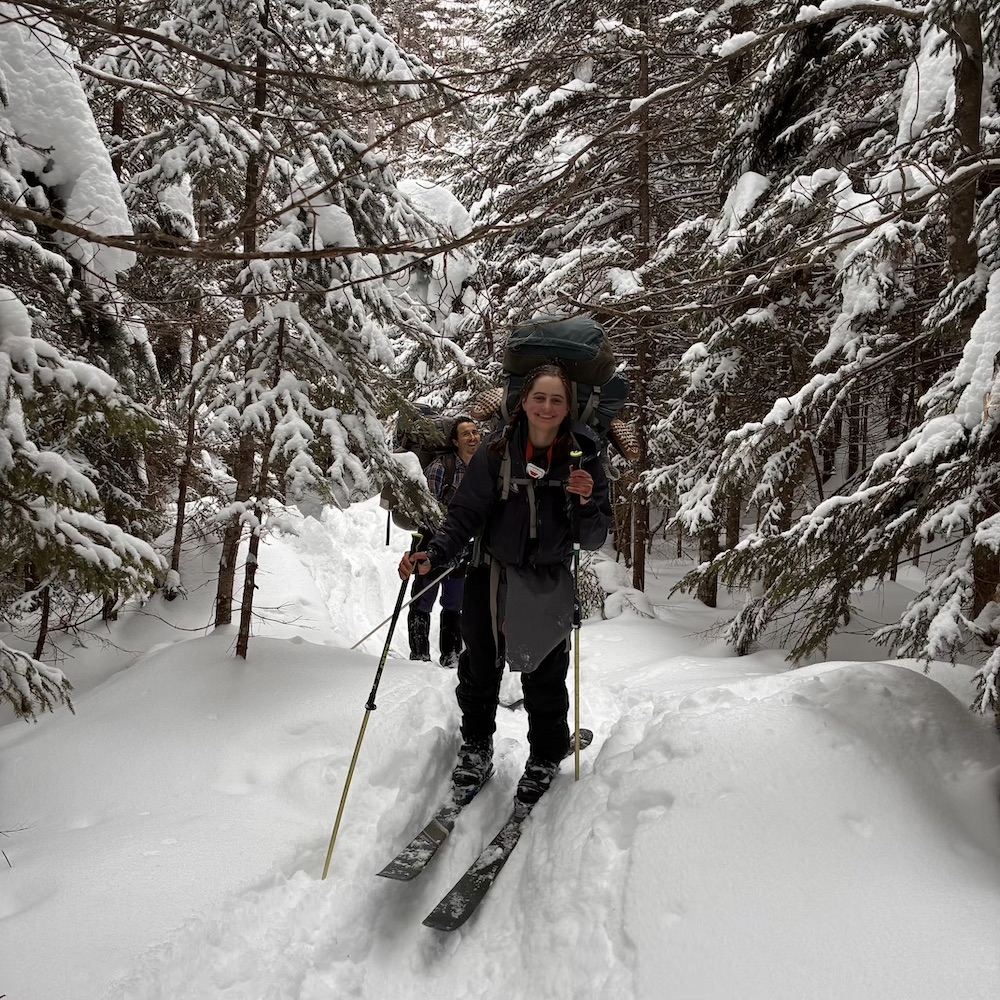 We climbed beautiful hills, following the Pemigewasset on a decommissioned railway, crossed the river, resupplied food, and skied up Tripoli road and into the White Mountains! We broke camp by an abandoned cellar hole, dubbing the camp “Old Settler’s Camp”