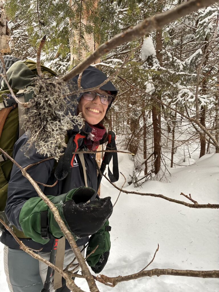 As I’m going, skiing along then stopping, then skiing a little further before stopping once more, moving as if I was a deer, I noticed the movement of legs through trees. Silently, I began looking closely, thinking at first that it was another student. Normally I’d holler to them, but since it’s a solo wander I didn’t want to disturb their peace. Then I noticed how long these legs are, darker up top, but whiter around the knee down, and hey it looks like another set of legs too, and is that a darkness in the brush? The realization sets in – I think that’s a moose. Uncertainty still lingers as it stops moving, blending into the world around it. My heart started pounding as I crept closer, careful to not make too much noise and scare it. The closer I got, the more unbelievable it seemed – a moose! A good sized cow, no antlers, and at this point, no more than 50 feet away. As I followed its tracks, closing the distance, I could see its large ears moving around every which way as it ripped the buds off saplings.