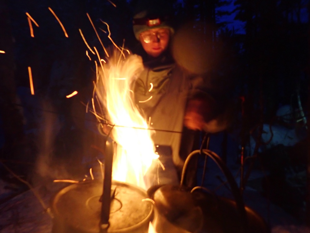 For the first time in weeks, the opportunity of solitude is offered to the students. A designated period for just being alone with their own thoughts, distinct from the voices of others. They break off in different directions for a 2 hour solo, during which they track through new snow, their ski tracks making fresh furrows beneath the evergreen branches, light fires, cook bannock on sharpened sticks, reflect, meditate and journal. Some savor the silence, careful not to contaminate it with the sound of their own voice. Others take the opportunity to listen to themselves, speaking aloud words they’ve held too tightly to, attempting to answer questions burning deep within. But these young wandering souls cannot answer these questions on their own, and so conversations are held with the forest: the trees, moss, wind and sky. Our own hearts are much too small to hold within them all we are asked to, but Mother Earth lends an eagerly listening ear, willing and ready to make room for our roving thoughts and existential fears. And perhaps, if you listen for a reply, the knowledge of many lifetimes will be granted you- ancient wisdom of the woods.