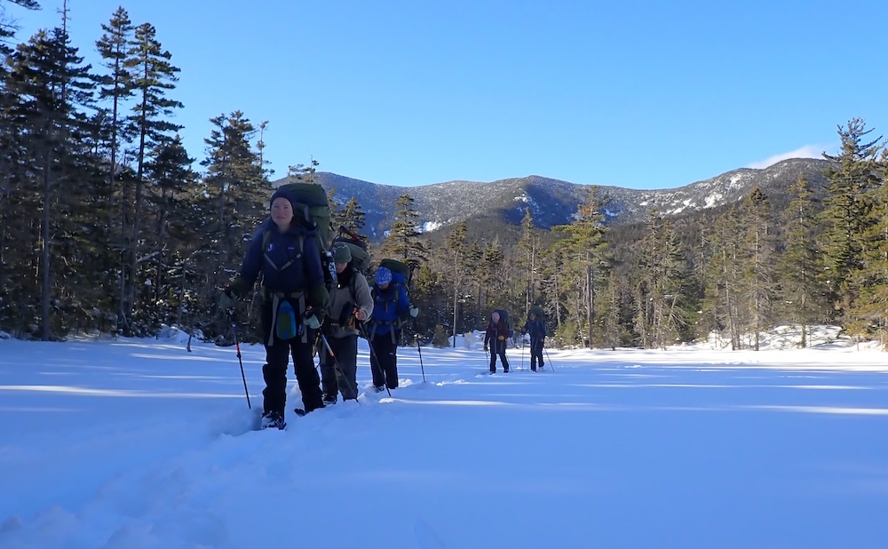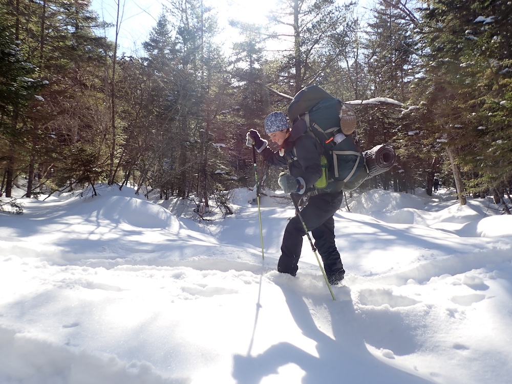We descended Hancock Notch, breaking once again through deep snow and on what can’t really be described as a “trail”. After hours, we popped out of wilderness and onto groomed snowmobile tracks, and got onto a nice bog – the moon that night was ringed in a giant halo. We set camp there, and slept.