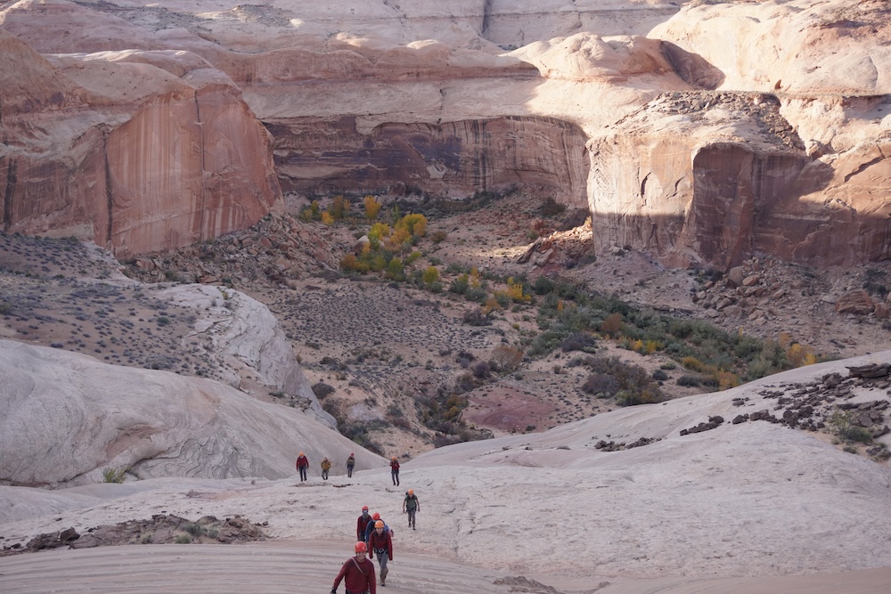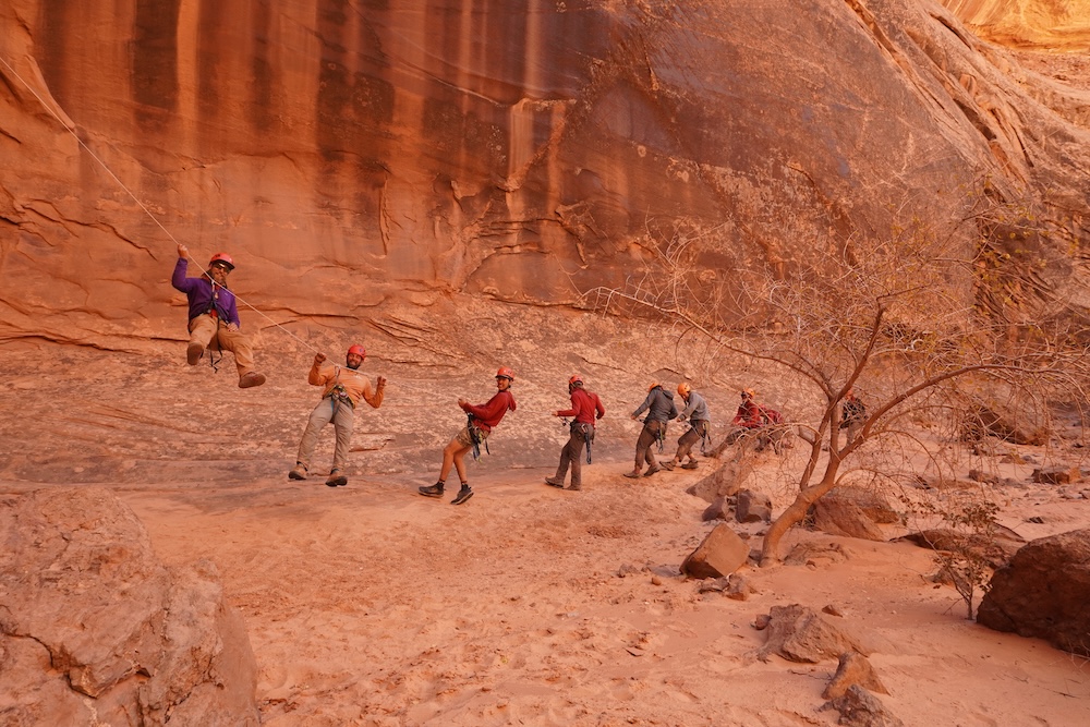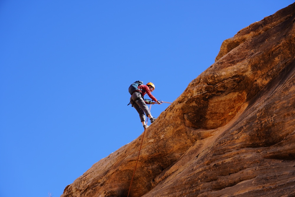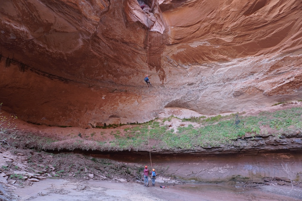 The next day was one of our most eventful. We left our lovely camp at Robbers’ Roost Springs and headed down the Middle Fork of the Robbers’ Roost canyon complex. We soon found ourselves standing above a 180 foot drop. This would be our longest rappel yet, and one we would have to do with our full packs on our backs. (The topography of the rappel was such that our original plan to lower the packs separately clearly wasn’t going to be an option.) We had to rig chest harnesses in order to keep from flipping upside down in mid air with the added weight of the pack. The rappel had three separate ledges to overcome, the last of which was overhanging. With your pack pulling you backward, you had to rely on your arms and core to stay upright on the single strand of rope.