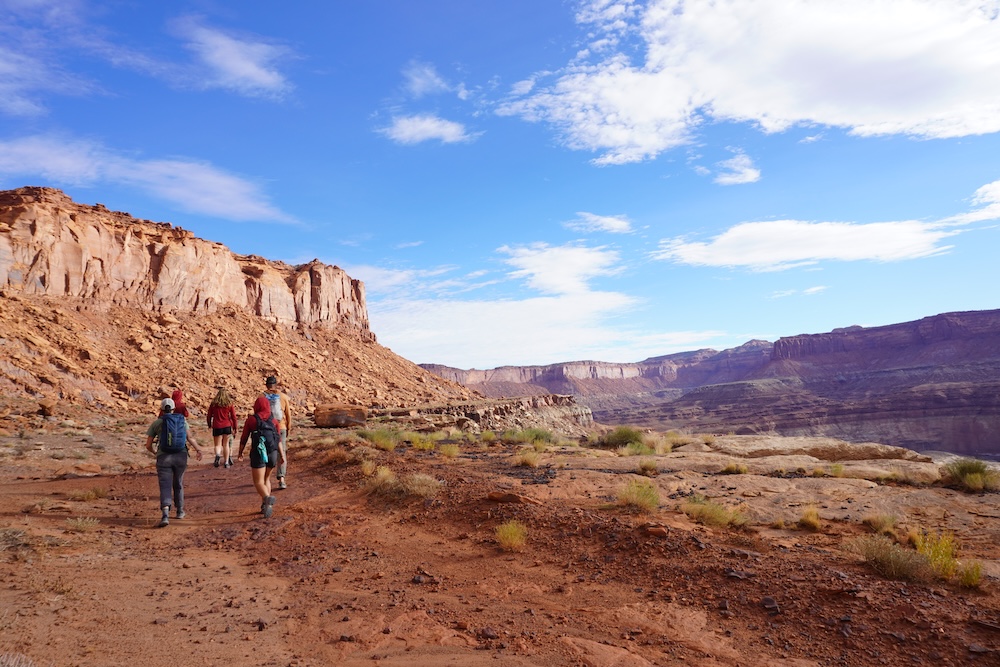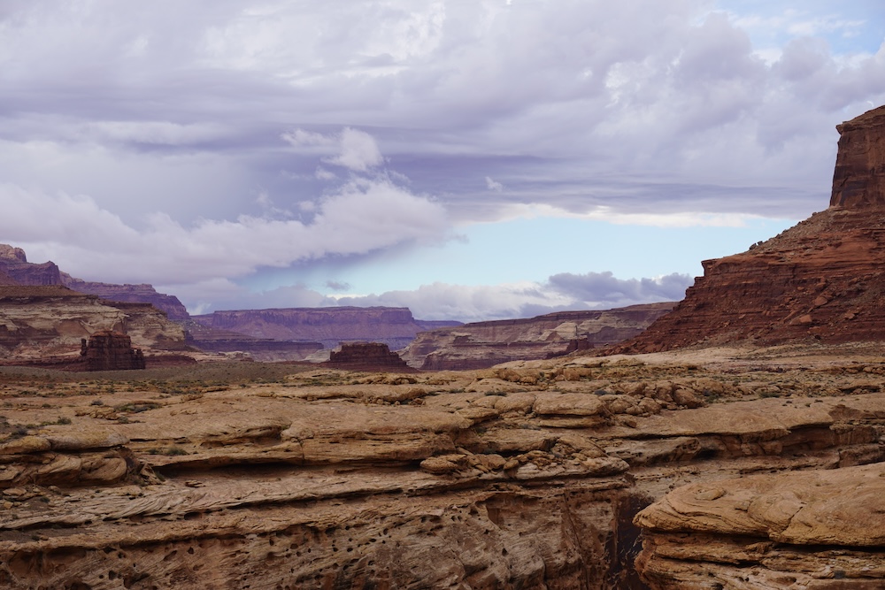 In the morning we continued along the bench we were on under ominous clouds. Lightning split the sky to the north, and rain dampened our matching red sun shirts, but the hot desert breeze dried our clothes as we hiked. We sought out patches of mineral soil to travel on, trying to avoid crushing the omnipresent cryptobiotic crust that is the foundation of the southern Utah ecosystem. At this point we were 200 feet above the river, but still about 600 feet below the rim. Ahead, we could see that the bench we were traveling on eventually ended. We discussed the prospect of being forced to turn around and hike three days back to the road.