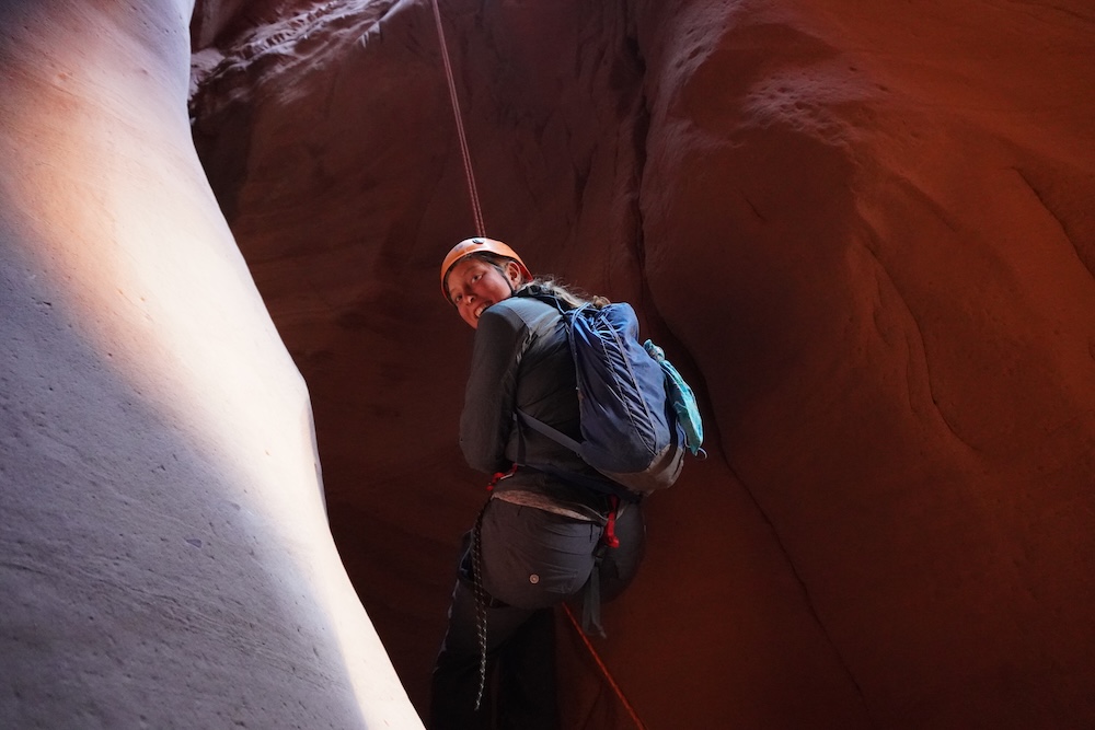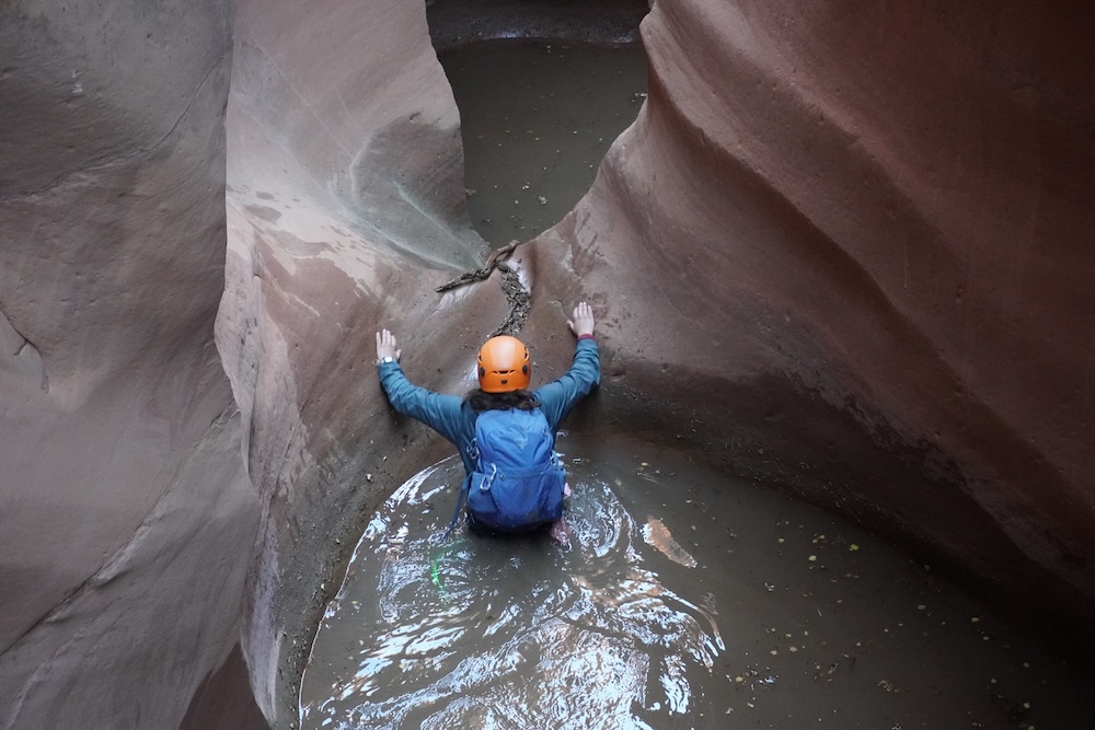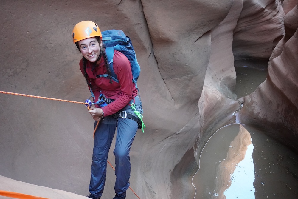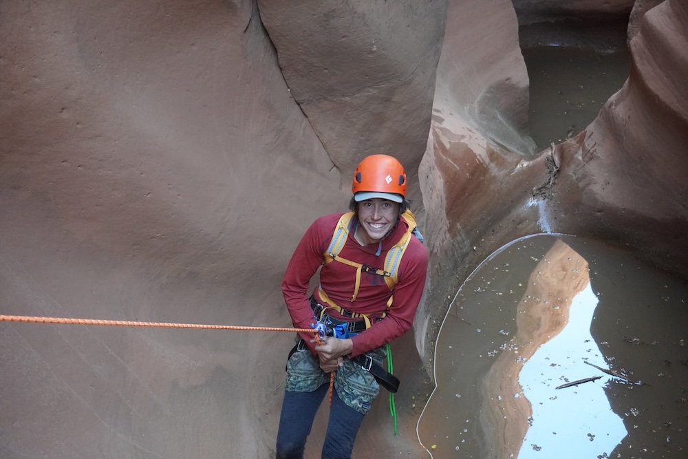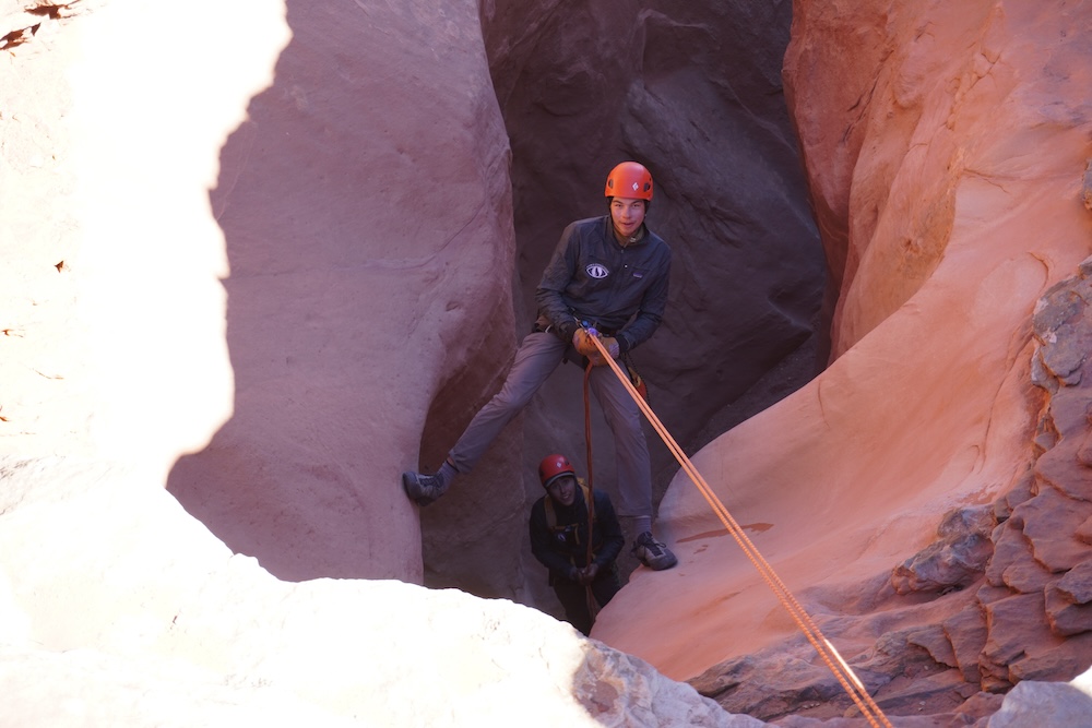 Our first day of hiking took us to the top of Alcove Amble, a technical slot canyon that would require ropes, harnesses, helmets, and plenty of determination to explore. The next morning we woke up eager to take on this challenge, but our first mission was to find potable water. (The Dirty Devil itself was also full of silt, and rumored to contain traces of arsenic and other heavy metals). We found a small pothole of relatively clear rainwater and filled our 10 liter water bags. After caching these back at camp, we scrambled down into the slot and were soon at the start of our first rappel, which included a short overhanging section.