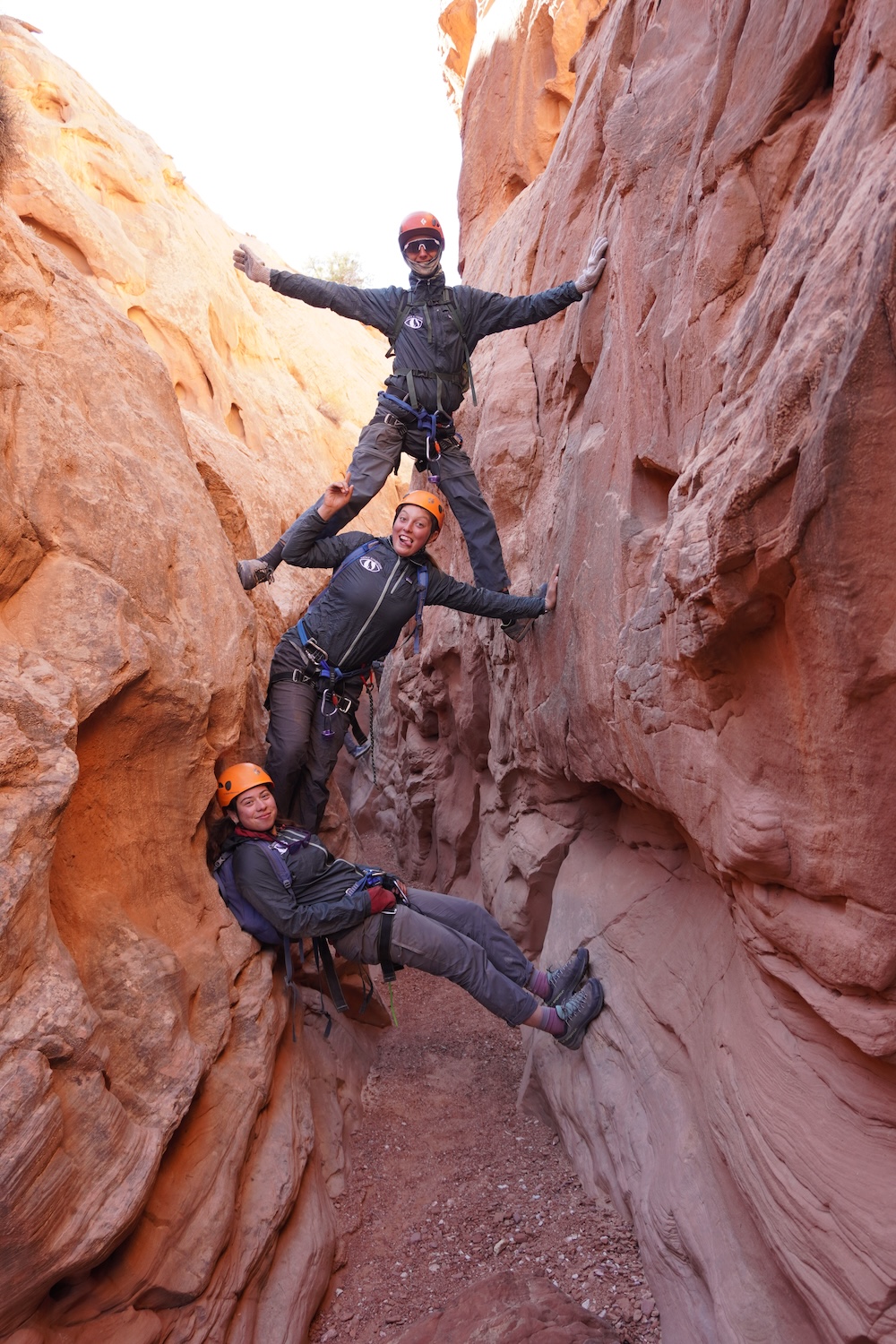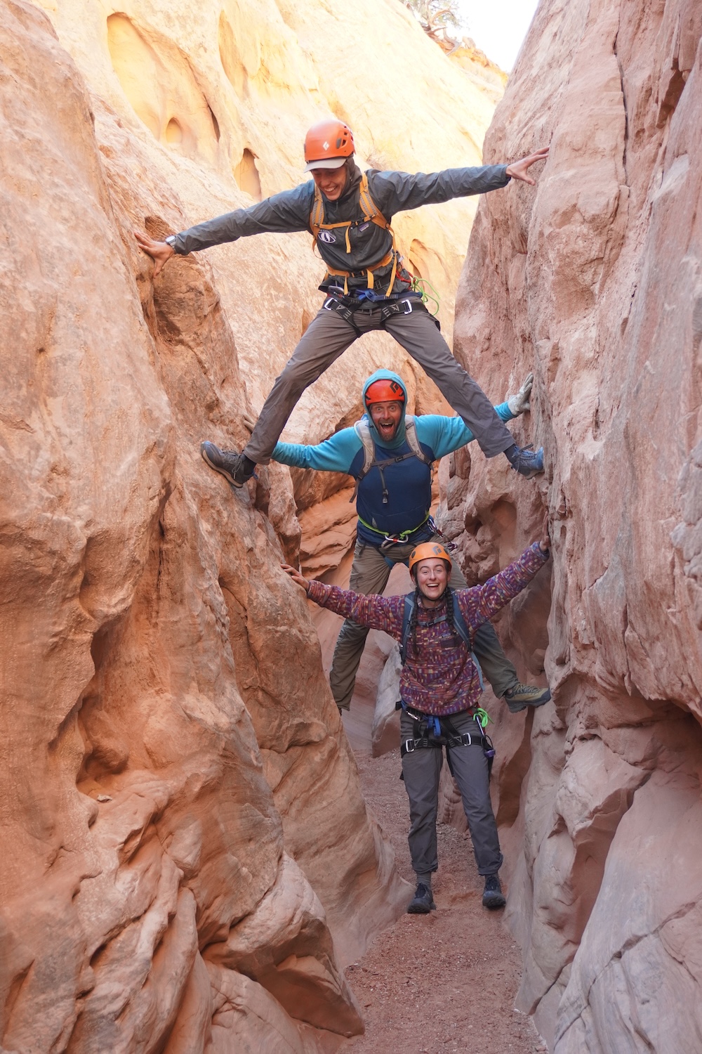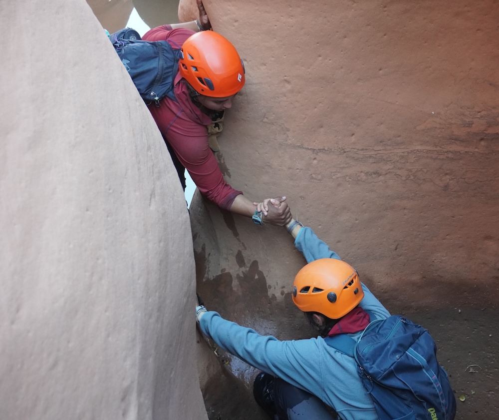 Our first day of hiking took us to the top of Alcove Amble, a technical slot canyon that would require ropes, harnesses, helmets, and plenty of determination to explore. The next morning we woke up eager to take on this challenge, but our first mission was to find potable water. (The Dirty Devil itself was also full of silt, and rumored to contain traces of arsenic and other heavy metals). We found a small pothole of relatively clear rainwater and filled our 10 liter water bags. After caching these back at camp, we scrambled down into the slot and were soon at the start of our first rappel, which included a short overhanging section.