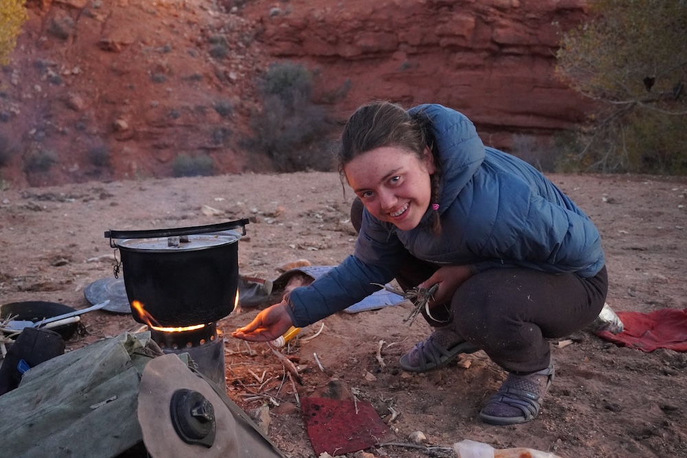 Day 3 (5 miles): Norah and Charlie were LODs. With a morning sleep in, we started our day chilly, and got some more “plant water.” We had a long day, climbing up to the mesa tops and hiking along overlooking the river. Once we descended back to the Dirty Devil, we did plenty of bushwhacking then walked through calf deep mud and trudged to our camp where we ate delicious (if somewhat sandy) Rababu (rice and lentils).